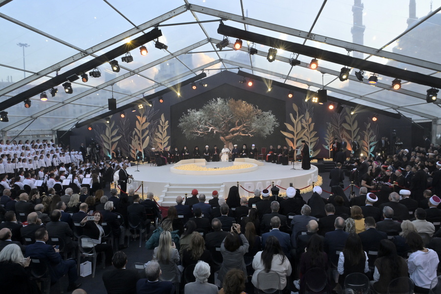 Το αποκορύφωμα της σημερινής ημέρας ήταν η διαθρησκευτική συνάντηση κάτω από μια πελώρια «σκηνή της ειρήνης», στην Πλατεία των Μαρτύρων, στο κέντρο της Βηρυτού, έναν εμβληματικό χώρο, σύμβολο της συλλογικής μνήμης.