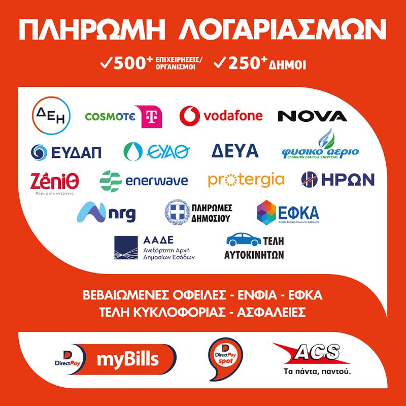 Μέσω της υπηρεσίας «DirectPay myBills», οι πελάτες της ACS μπορούν να συνδυάζουν τις αποστολές τους με την εύκολη, γρήγορη και ασφαλή εξόφληση των λογαριασμών τους (ρεύμα, τηλεφωνία, ύδρευση, κ.ά.) κατά την επίσκεψή τους σε οποιοδήποτε από τα 223 σημεία εξυπηρέτησης του δικτύου πανελλαδικά που προσφέρουν την υπηρεσία, εξοικονομώντας πολύτιμο χρόνο.