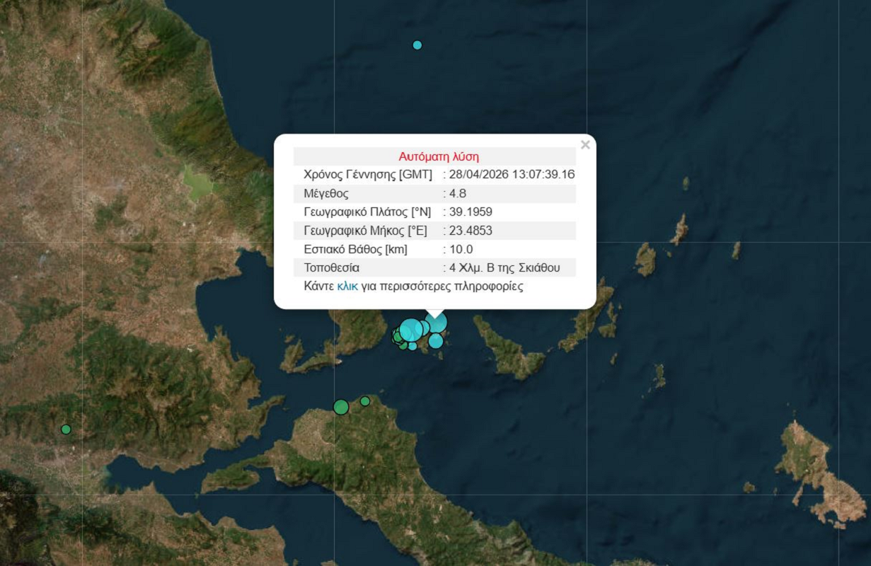 Νωρίτερα, έγινε ακόμη ένας ισχυρός σεισμός 4,7 Ρίχτερ, στην Σκιάθο. Οι σεισμικές δονήσεις έγιναν αισθητές και σε περιοχές της Αττικής.